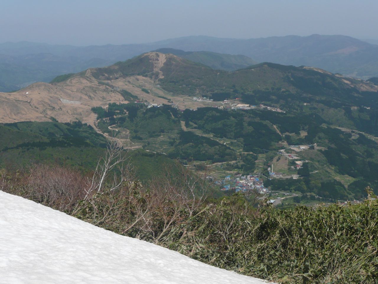 登山道に残る雪 笹の中の道を山頂へ 山頂の避難小屋 360度の展望 鳥取県側 鉢伏山